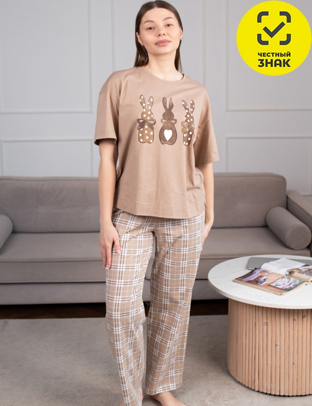Пижама женская состоит из футболки и брюк. Футболка из гладкокрашеного трикотажного полотна, круглый вырез горловины, короткие втачные рукава, на полочке печать. Брюки из набивного полотна, прямого силуэта, с поясом на резинке.