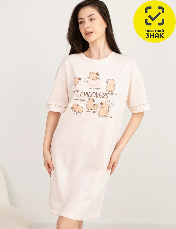 Женская сорочка из набивного хлопкового трикотажа, с короткими рукавами, круглым вырезом горловины, на полочке печать.