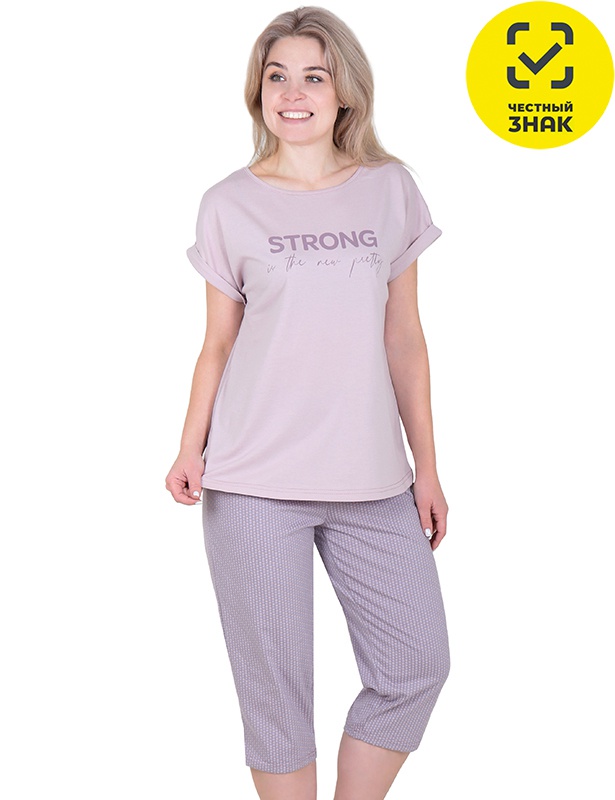 Пижама состоит из футболки со спущенным рукавом и бридж. Футболка с коротким цельнокроеным рукавом с отворотом, округлый вырез горловины окантован бейкой из основного полотна, на полочке печать. Однотонные нежные полотна пижамы украшает модный принт в виде надписи, который отлично гармонирует набивным рисунком бридж.
