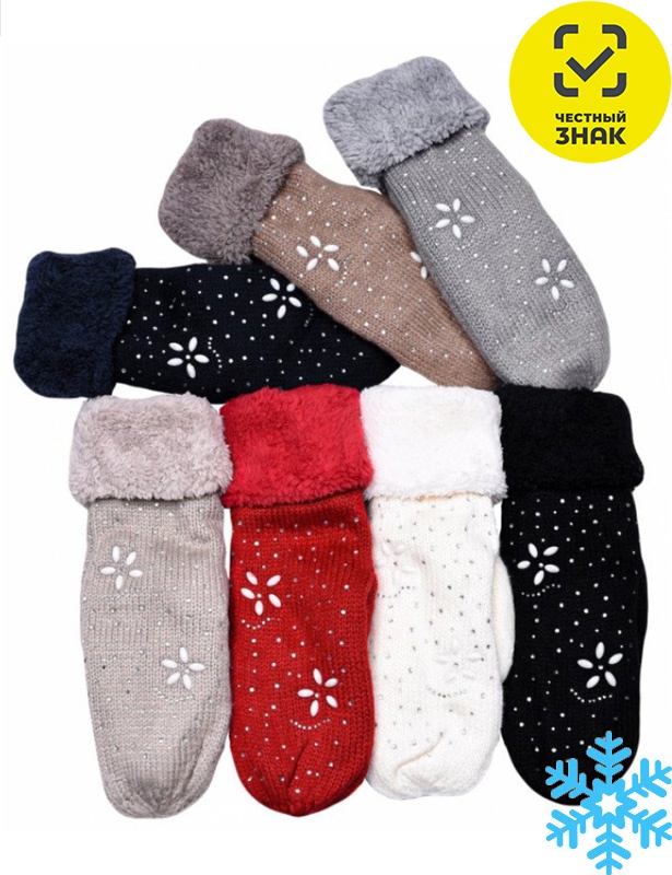 Женские варежки вязаные, с подкладом из искусственного меха, декорированы композицией из страз.