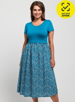 Отрезное по талии в комбинации двух видов в единой цветовой гамме: гладкокрашеного полотна «кулирка» с лайкрой (лиф) и плательной штапельной ткани (юбка) с набивным рисунком, удлиненное, отрезное по талии, с короткими втачными рукавами, горловиной овальной формы, окантованной основным материалом и декоративной планкой в шве соединения лифа с юбкой. Юбка по шву соединения с лифом присборена.